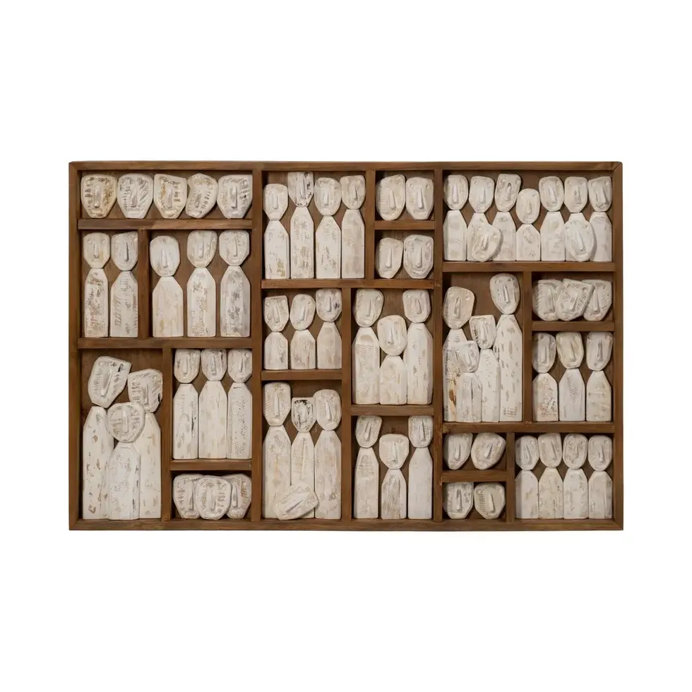 Ce tableau captivant présente une série de figurines en bois sculptées et peintes en blanc, délicatement agencées dans une boîte compartimentée. Son esthétique minimaliste et intemporelle met en valeur la pureté des formes et la texture naturelle du bois, offrant une œuvre à la fois apaisante et intrigante. Parfait pour apporter une touche artistique et authentique à tout intérieur.